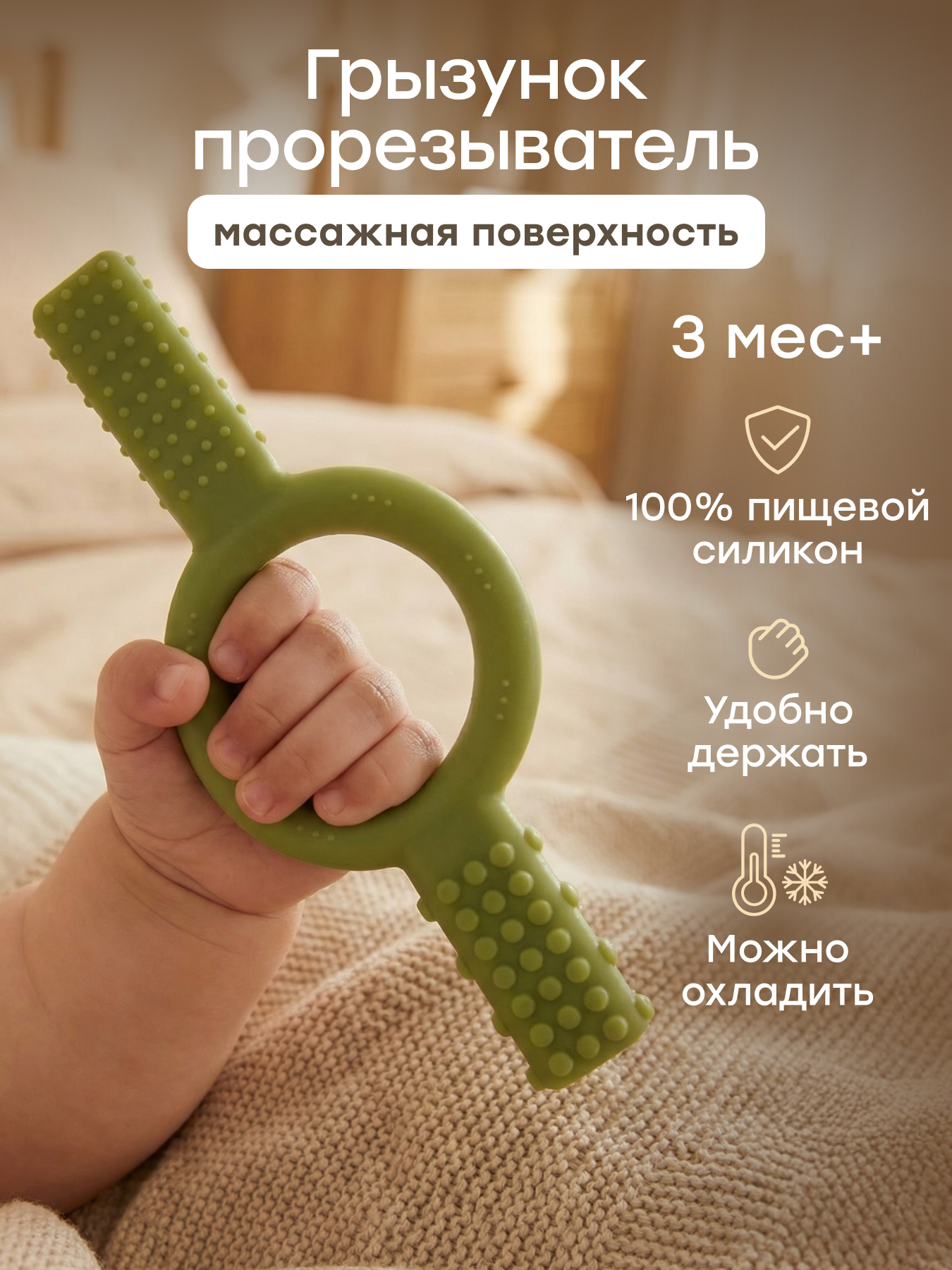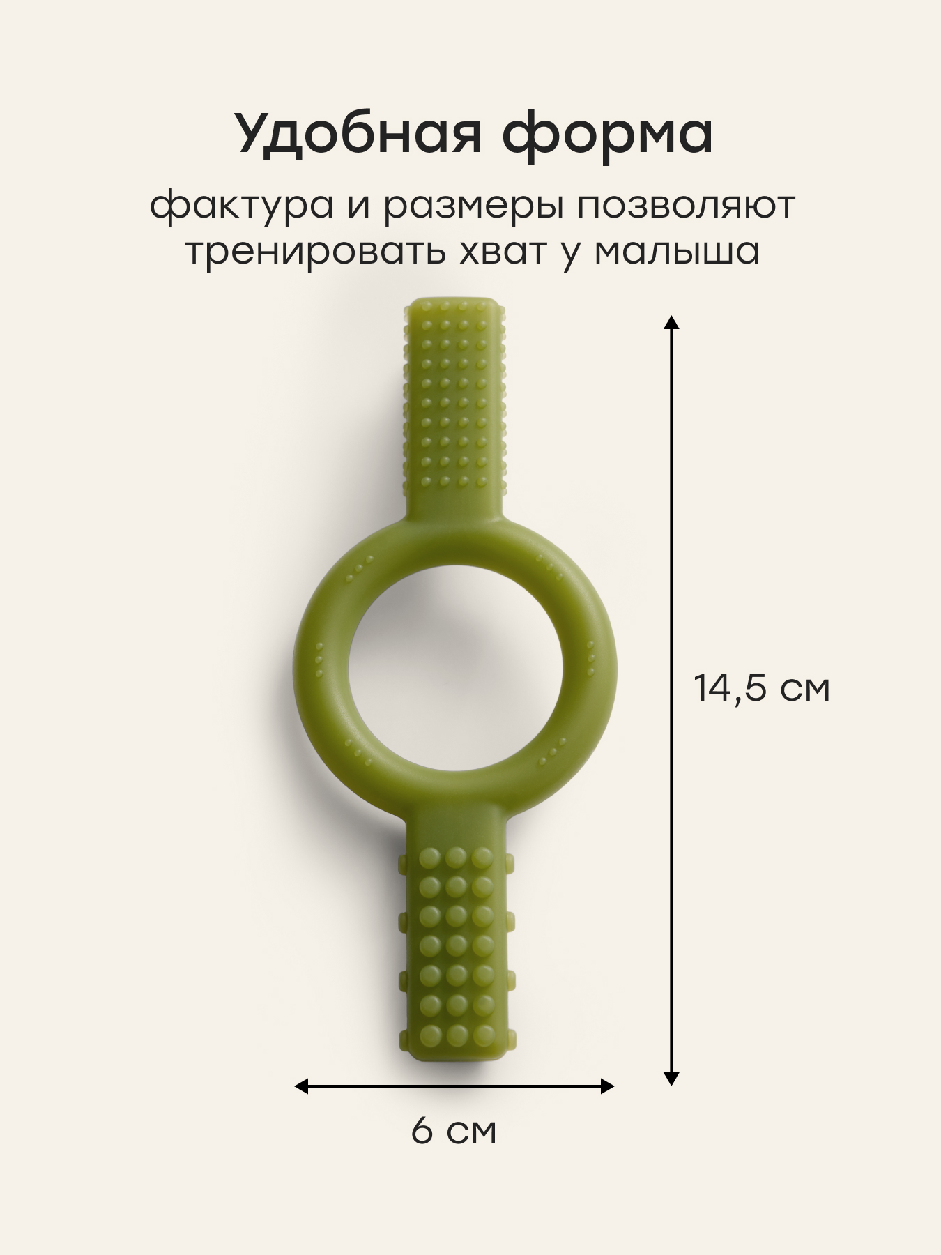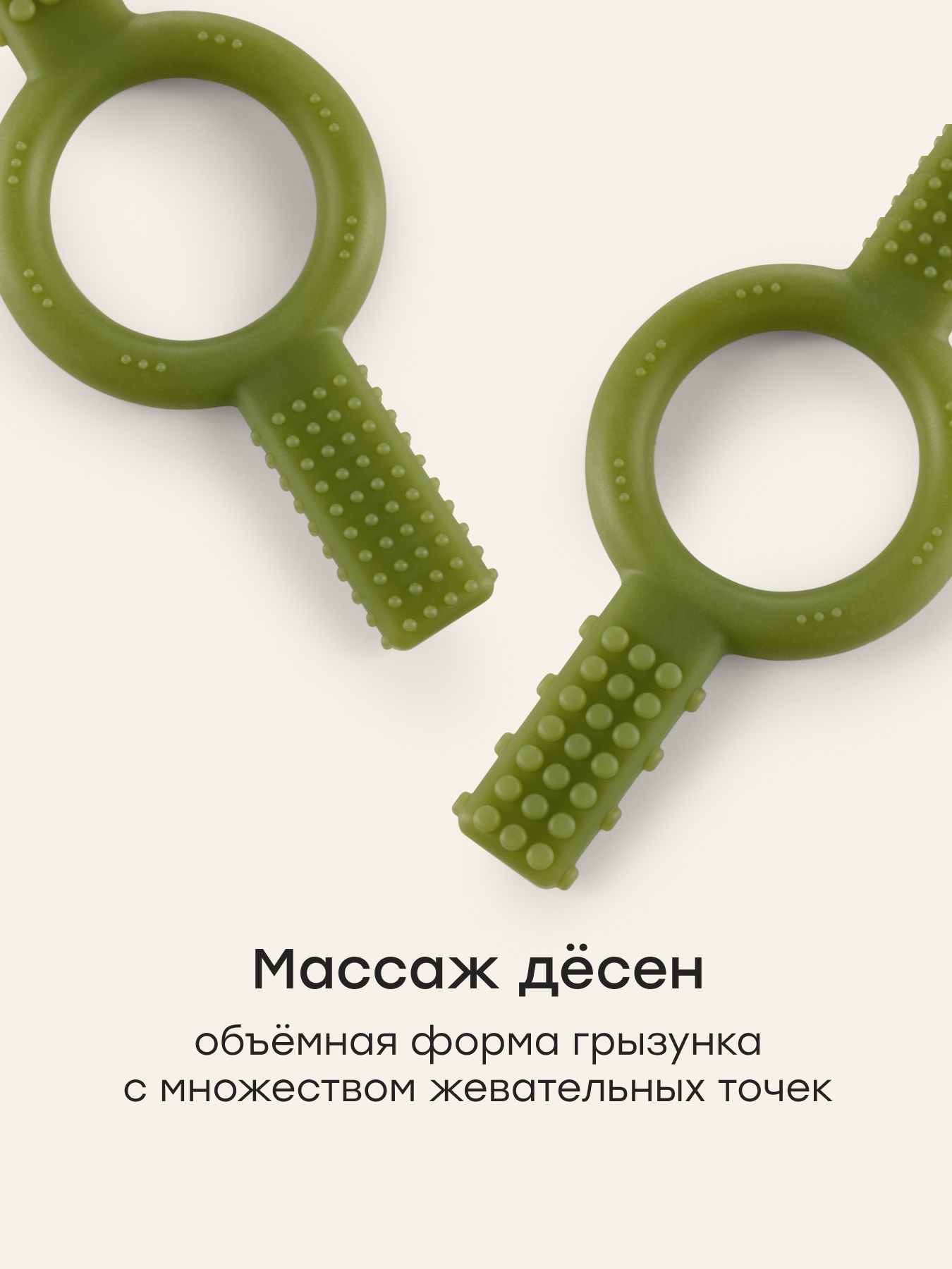 • Разная фактура поверхности обеспечивает эффективный массаж десен малыша и стимулирует жевание, помогая малышу быстрее справляться с дискомфортом при прорезывании первых зубов