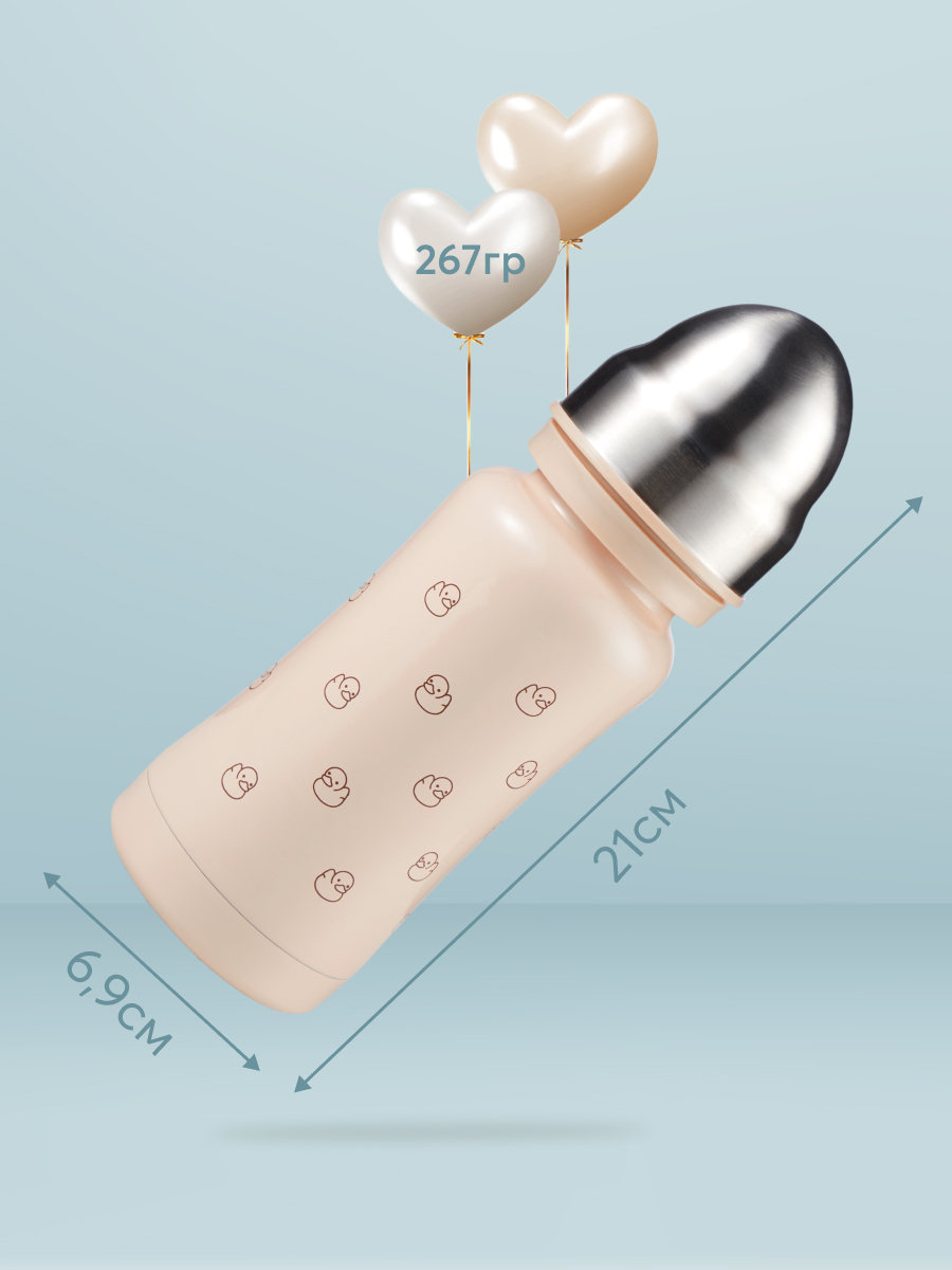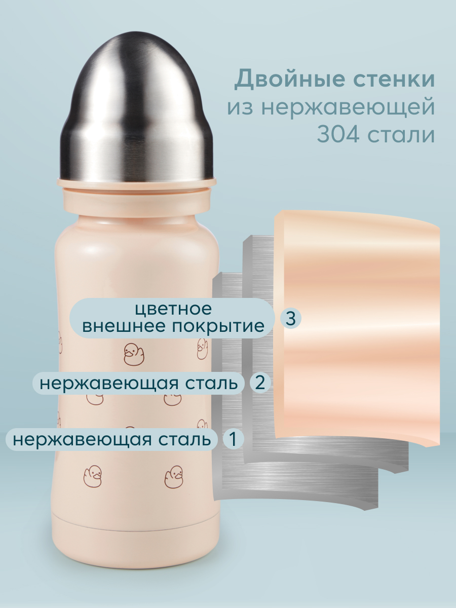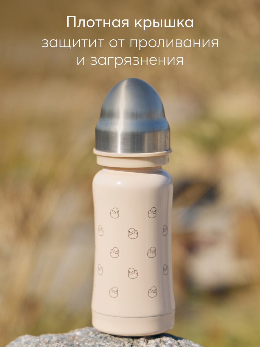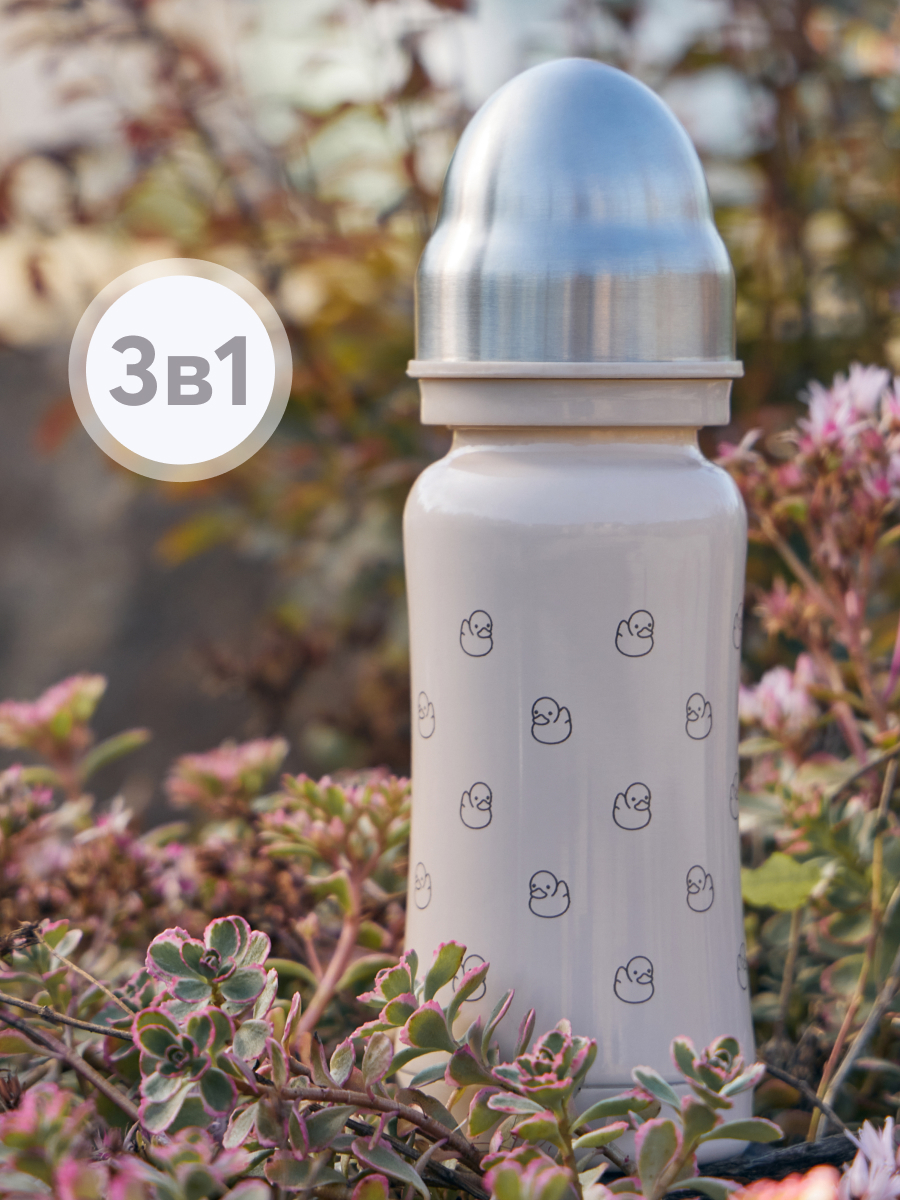 Термобутылочка имеет преимущество перед бутылочками для кормления из пластика – она дольше сохранит температуру жидкости и позволит иметь под рукой горячую воду или теплую смесь во время похода в поликлинику, в магазин или небольшую поездку. Удобно использовать для готового питания или горячей воды – в термос можно заливать жидкость температурой до 100°С. В комплекте 2 насадки: соска для малышей и соска-поильник непроливайка для малышей постарше, а также бутылочка имеет антиколиковую систему. Корпус из нержавеющей 304 стали сужается к середине, бутылочку приятно и удобно держать в руках детям и взрослым. Благодаря покрытию и конструкции бутылочки, корпус не обжигает, даже если внутри кипяток. Плотная крышка закрывает бутылку, исключая вытекание жидкости и попадание грязи на соску.