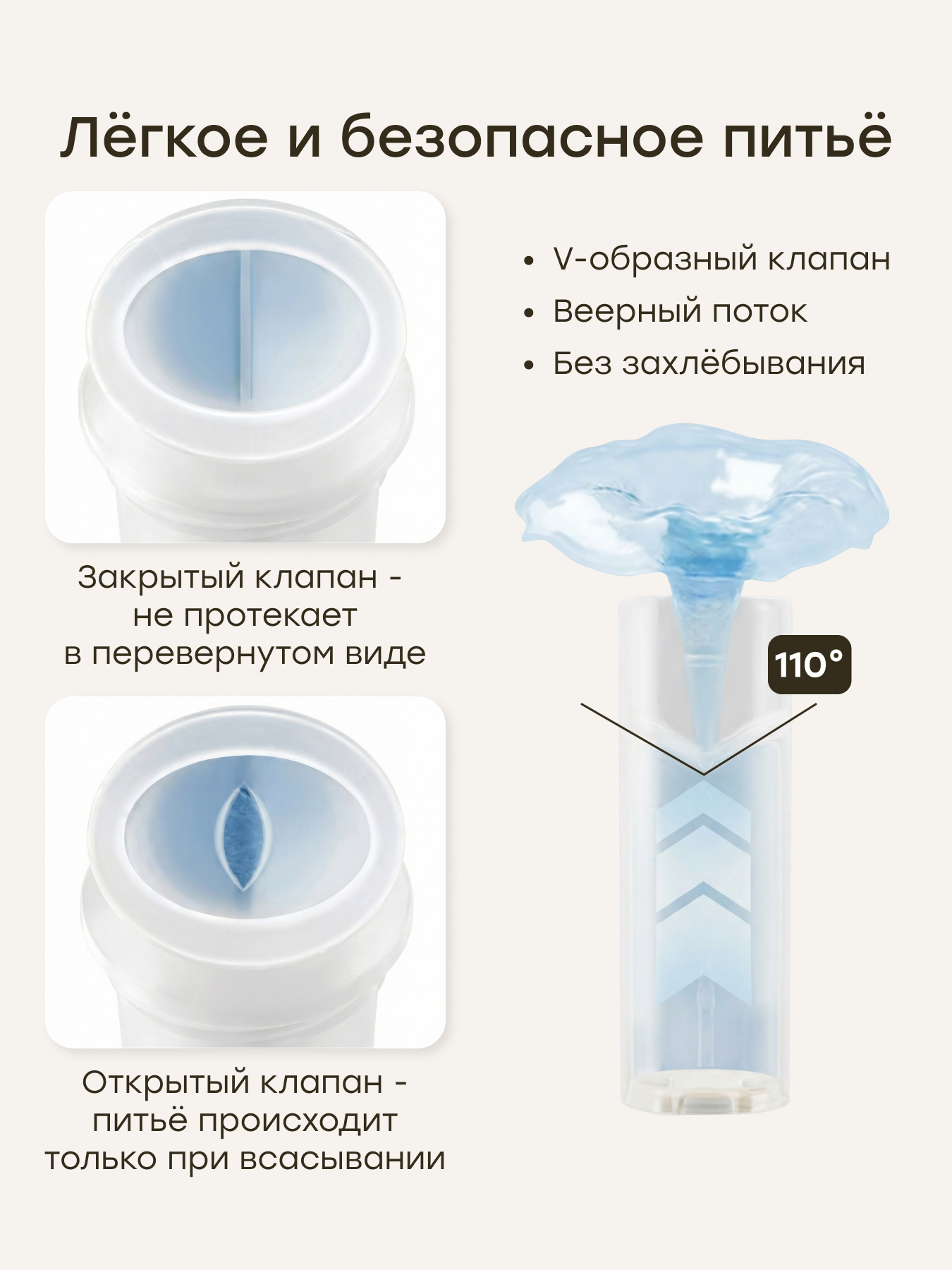 • Безопасность и гигиеничность - бутылочка оснащена трубочкой с V-клапаном, а сама крышка имеет защиту от случайного открытия